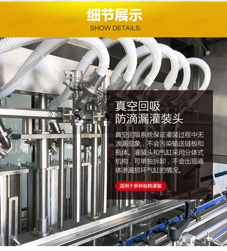 5、具有無(wú)瓶不灌裝、自動(dòng)進(jìn)瓶出瓶、自動(dòng)定位灌裝、自動(dòng)控制液位等功能,自動(dòng)化程度高;灌裝嘴設(shè)計(jì)科學(xué)合理,配防滴漏裝置,灌裝不滴漏,擁有物料瓶及設(shè)備的干凈衛(wèi)生。